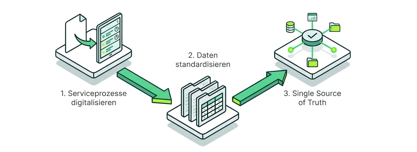 Planung, Durchführung und Dokumentation von Serviceeinsätzen laufen in einer gemeinsamen Systemarchitektur zusammen. Damit entsteht eine durchgängige Prozesskette – und eine Datenbasis, auf der KI-Funktionen später gezielt und wirtschaftlich eingesetzt werden können.