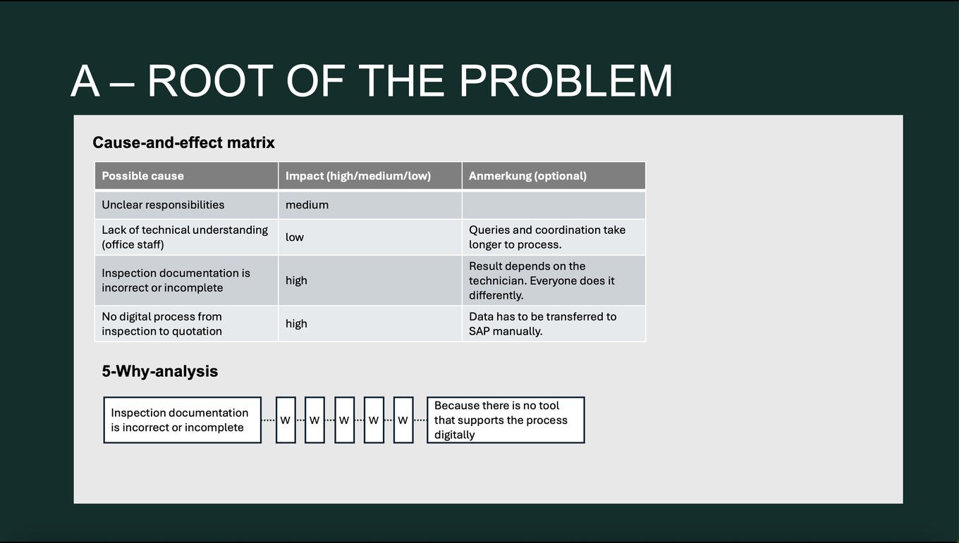 The cause-effect matrix reveals the decisive influencing factors. The next step is to understand why these problems arise in the first place, in order to reach the root cause.