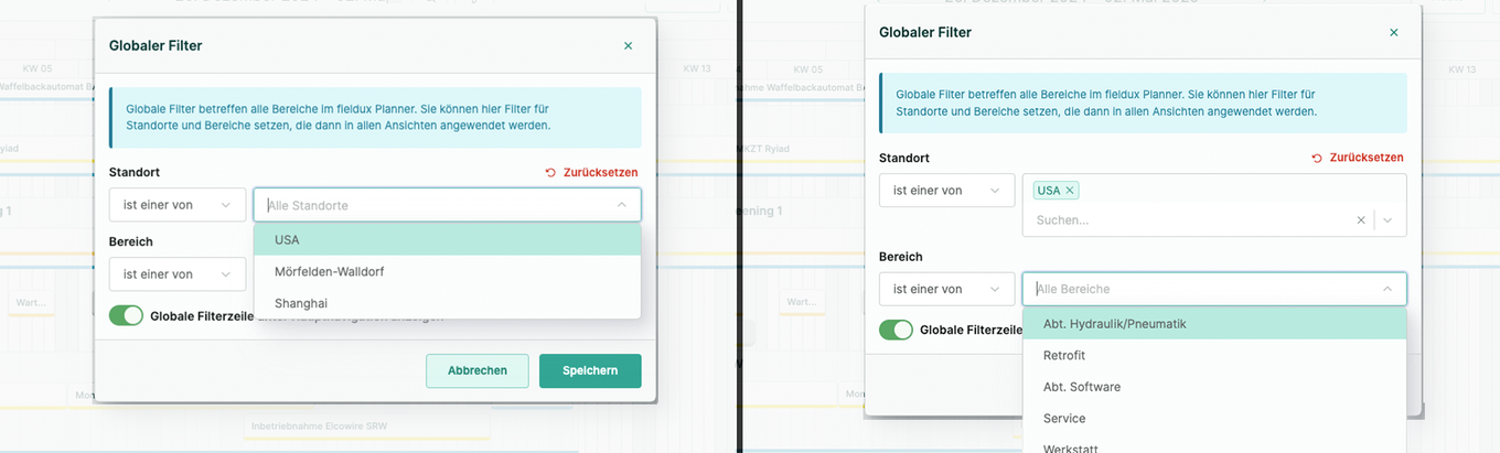 We've also added a new global filter function. This is really going to be useful for our customers with international branches and cross-departmental collaboration. They can now share data between branches and departments and schedule technicians across departments and locations. Now, communication will flow seamlessly. This means that fieldux can be used as a single source of truth for all cross-departmental collaboration between different branches and business units at our customers.